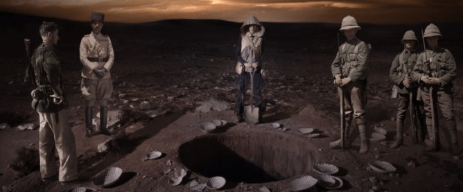 Em In the Future They Ate from the Finest Porcelain (No Futuro, eles comiam da melhor porcelana, Larissa Sansour/ Søren Lind, 2016), Sansour enterra-se e escava-se para criar sua especulação própria (e coletiva). O seu projeto artístico é arquivo e ficção. Afundar-se dentro da terra (que não se possui) e da memória (que não se possui). E ressurgir não como fato, mas como ficção. Evidenciando no gesto a fabricação de todo e qualquer