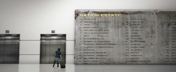 Em Nation Estate (Patrimônio nacional, Larissa Sansour, 2012), é um edifício corporativo que possui toda uma nação ou toda uma nação que possui um edifício corporativo? A reencenação nesse caso se dá na apresentação do território (já despossuído) da Palestina como artifício do biocontrole da “alta vida”. A comida sintética e a paisagem falsa como marcadores da mitologia fundante da geopolítica contemporânea: a soberania do estado nação.